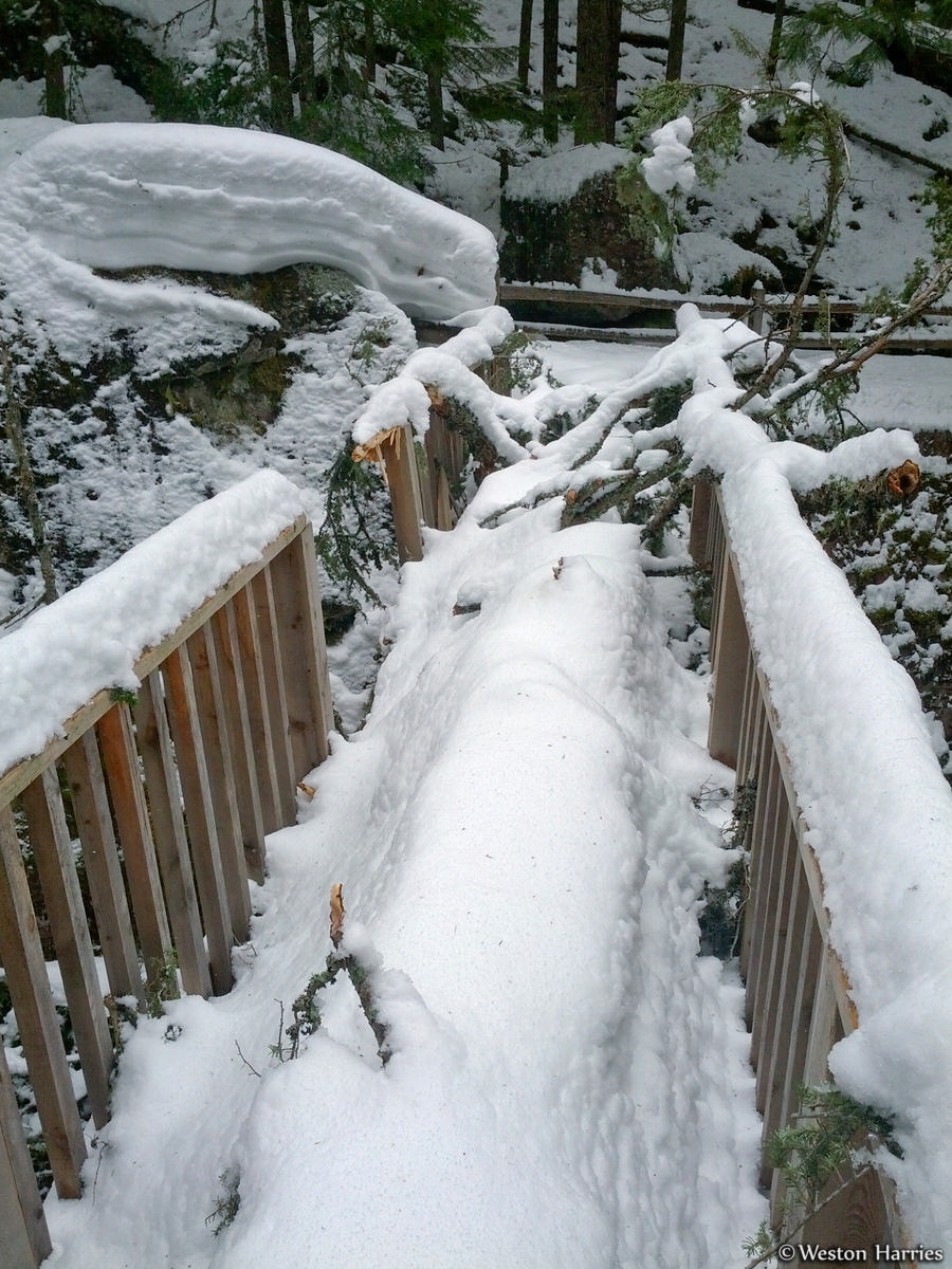 - Fallen Tree Breaking the Avalanche Gorge Bridge in Winter, Glacier NP -