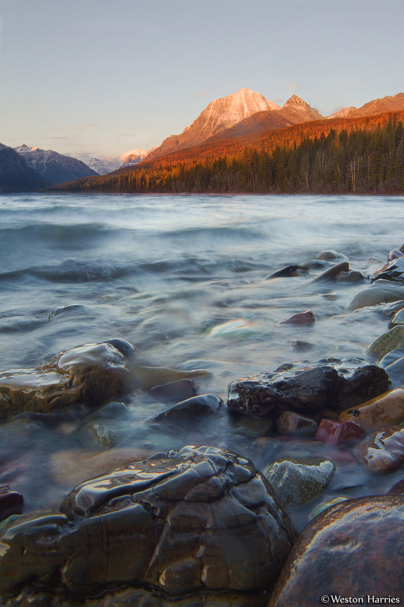 - Blurred Waves on Bowman Lake at Sunset, Glacier NP -