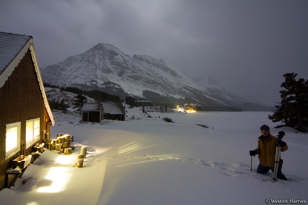 - Many Glacier Cabin and Winter Caretaker, with Allen Mtn Under Moonlight Behind, Glacier NP -