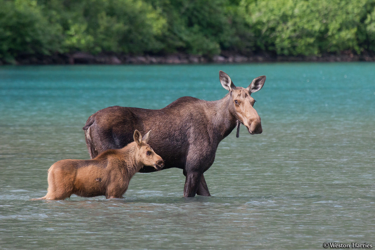 - Moose Cow and Calf Wading in Turquoise Colored Grinnell Lake, Glacier NP -