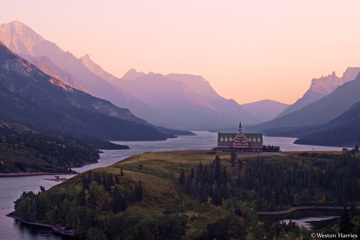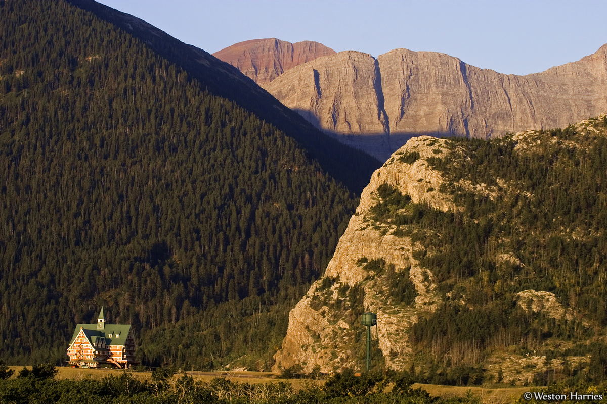 - Prince of Wales Hotel and surrounding terrain at sunrise, Waterton Lakes NP, Canada -