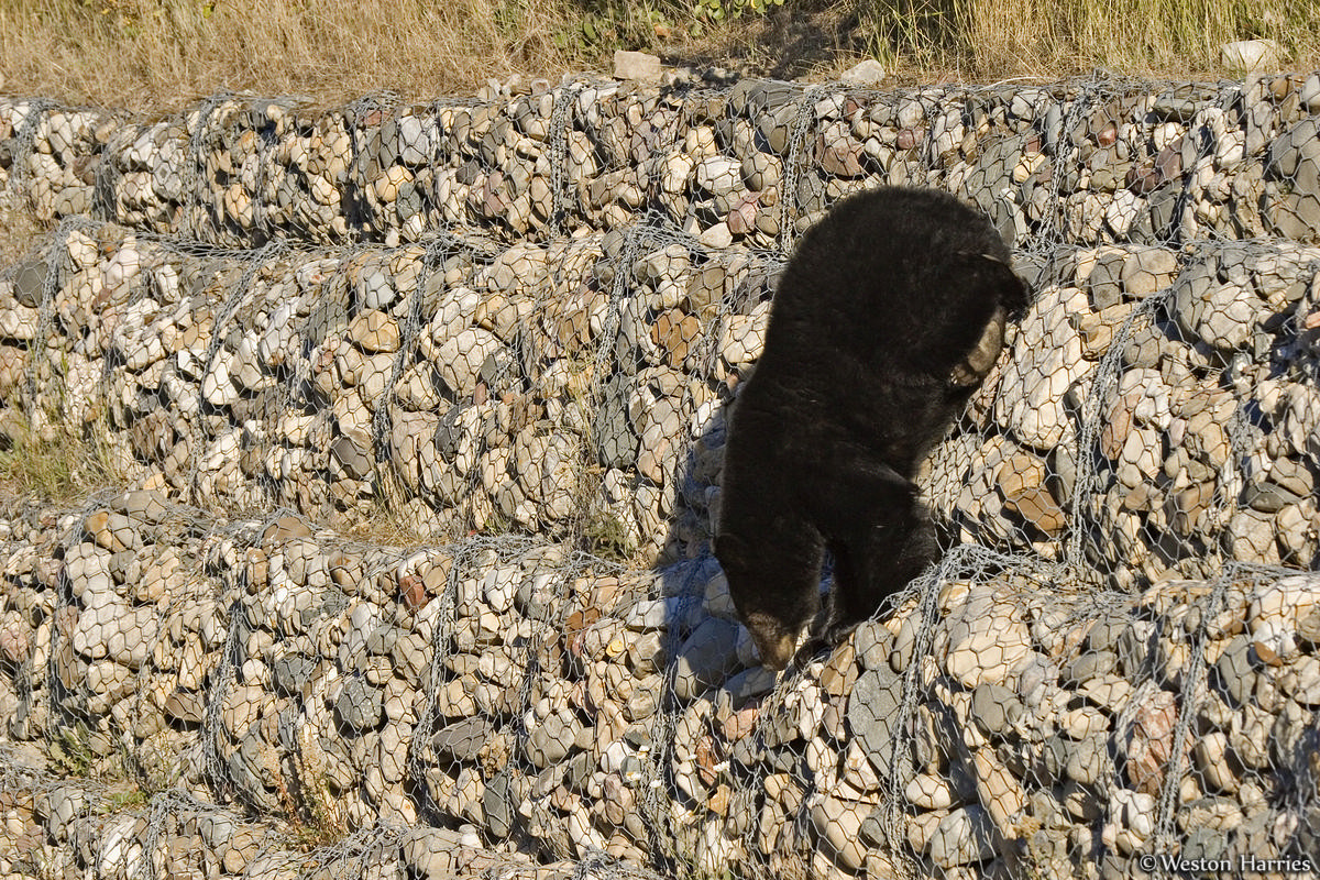 - Black Bear climbing down a retaining wall, Waterton Lakes NP, Canada -
